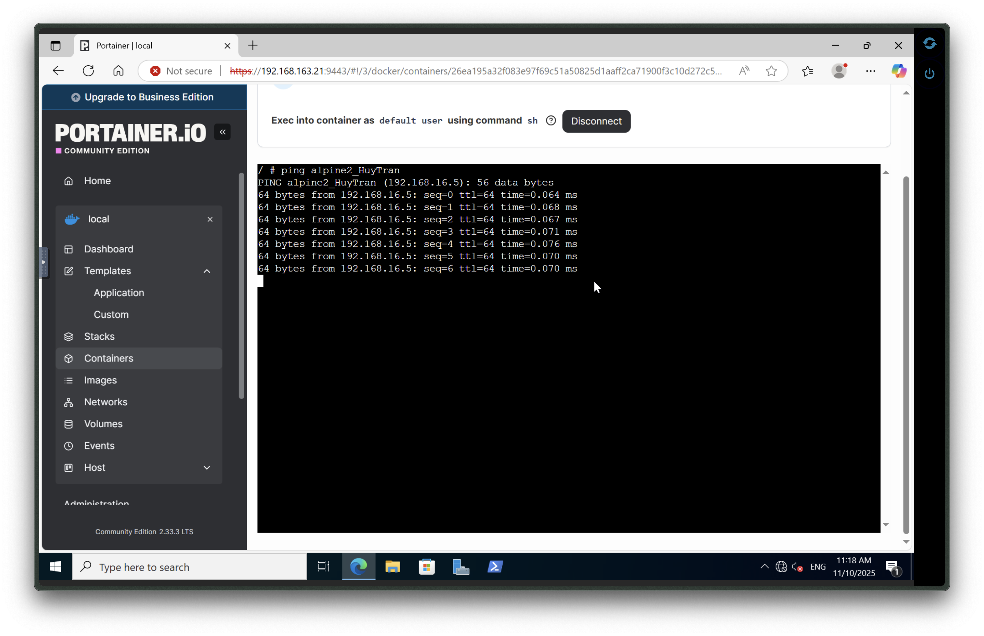 Open nginx_yourname container details, under Container Status → Console, connect to the console and run the command ping redis.