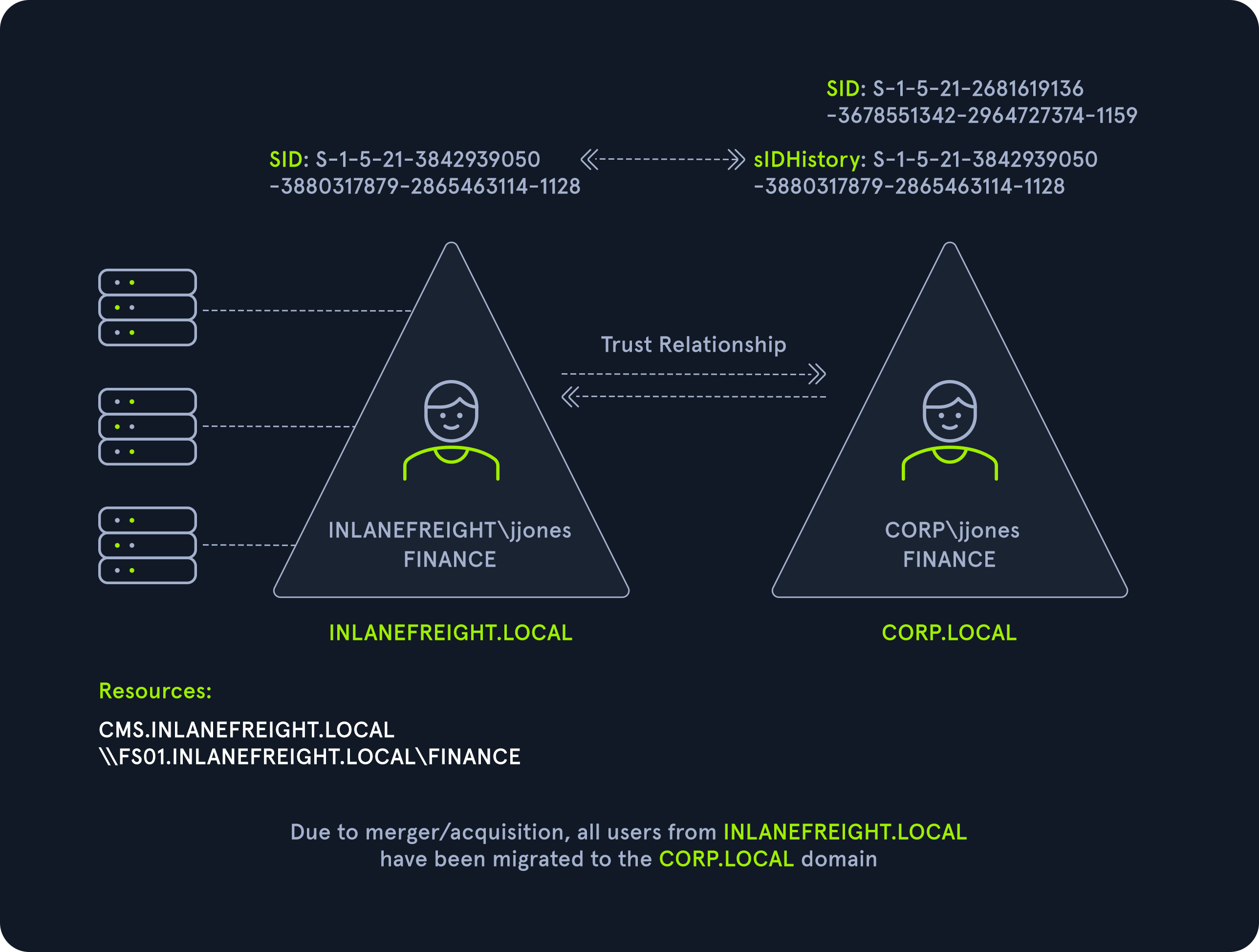 SID History can also be abused across a forest trust. If a user is migrated from one forest to another and SID Filtering is not enabled, it becomes possible to add a SID from the other forest, and this SID will be added to the user’s token when authenticating across the trust. If the SID of an account with administrative privileges in Forest A is added to the SID history attribute of an account in Forest B, assuming they can authenticate across the forest, then this account will have administrative privileges when accessing resources in the partner forest.
