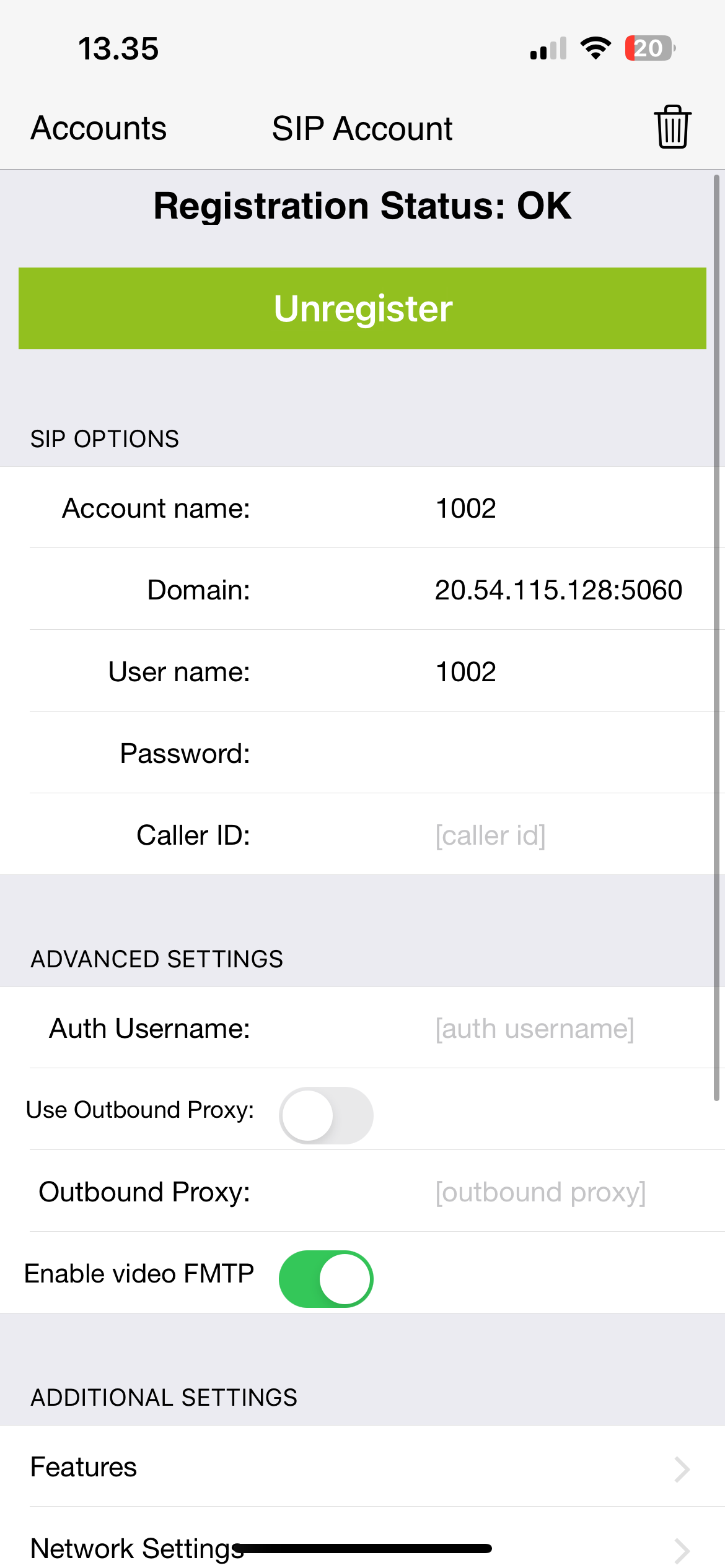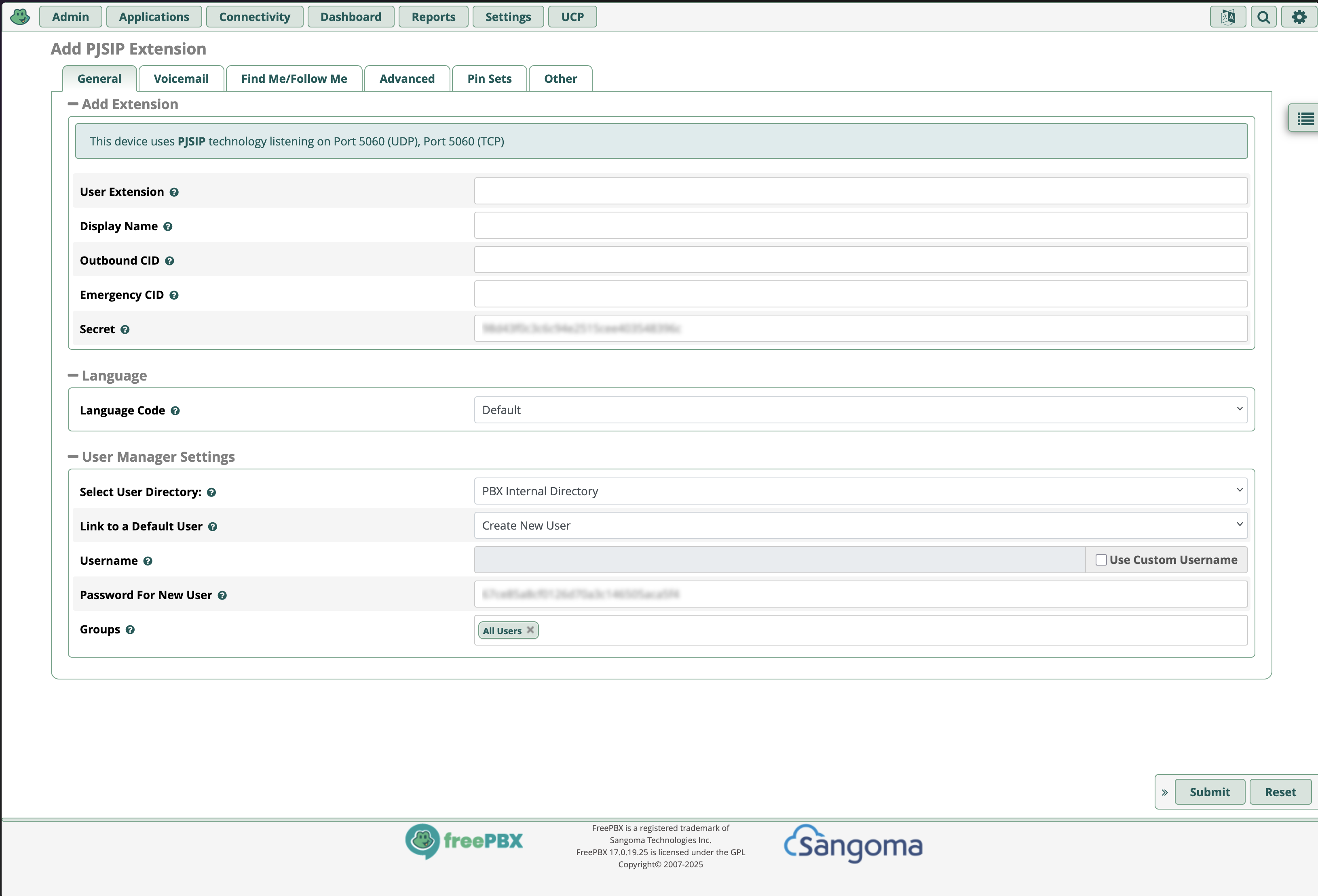 Remember the User Extension and Secret fields. They will be used to register the SIP device.