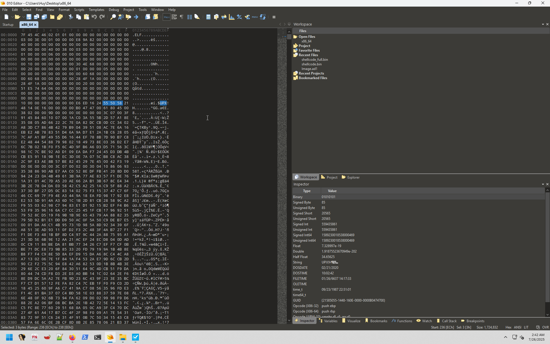x86_64: ELF 64-bit LSB shared object, x86-64, version 1 (SYSV), statically linked, no section headerSo the artifact is a Linux ELF (64-bit). It does not say much, so I went further by using hex editor: