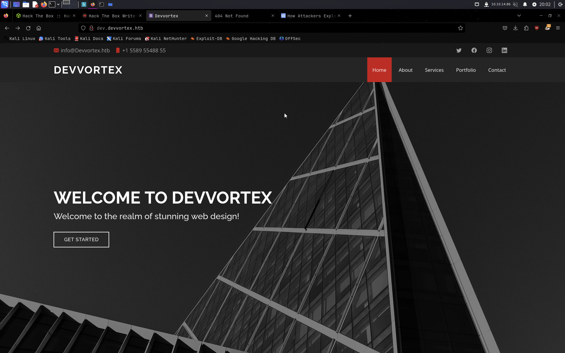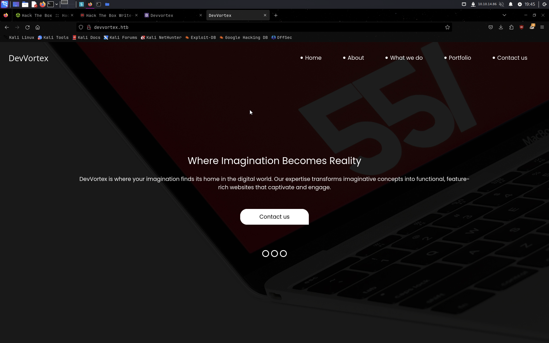 # Nmap done at Wed Dec 6 12:32:05 2023 -- 1 IP address (1 host up) scanned in 75.89 secondsThe machine has two open ports: 22 and 80. The http service is running on port 80. Added the devvortex.htb to the /etc/hosts file and visited the website.