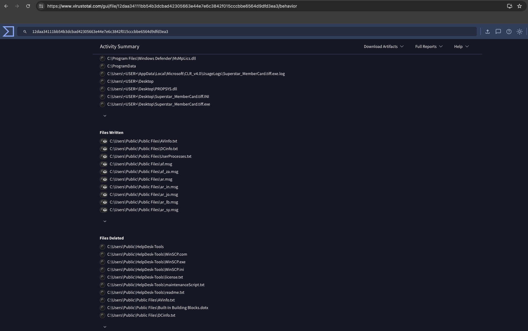 The Files Written section showed that almost all files are written to C:\Users\Public\Public Files.