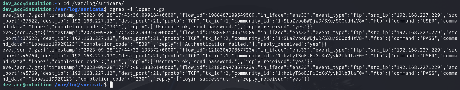 Fortunately, the login credentials of the lopez user were found in the /var/log/suricata folder. Suricata is an open source network detection tool that can capture the login information.