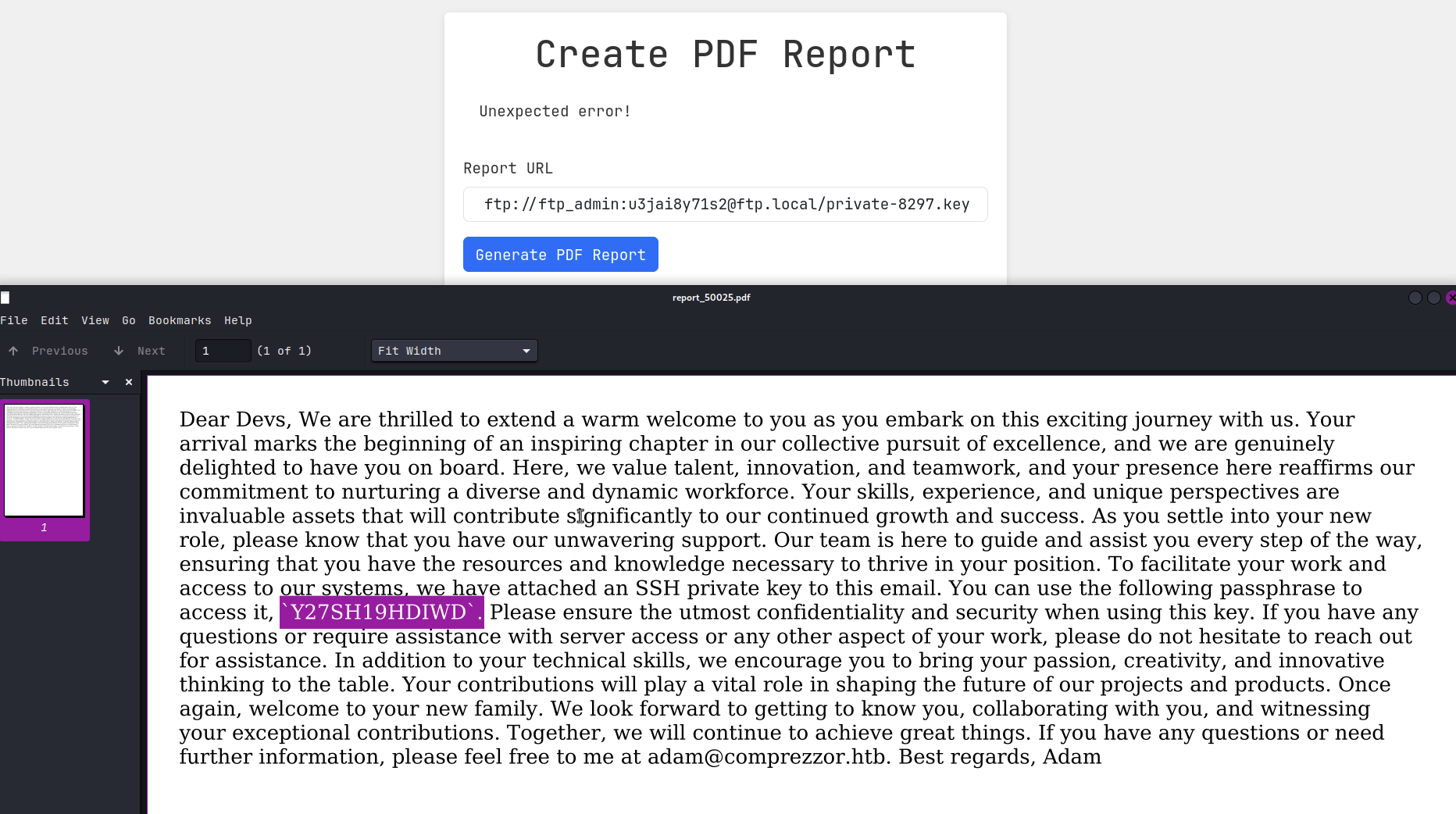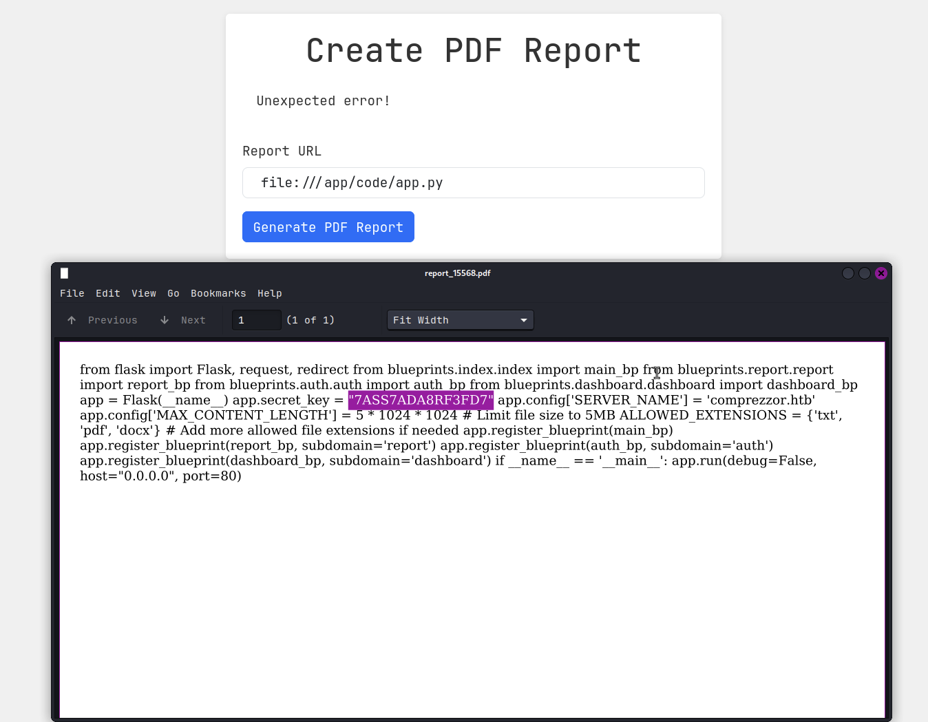 I did some enumeration and found that the wkhtmltopdf is installed on the machine. I tried to create a PDF report with the following payload. However, seems like we cannot proceed further with this method.