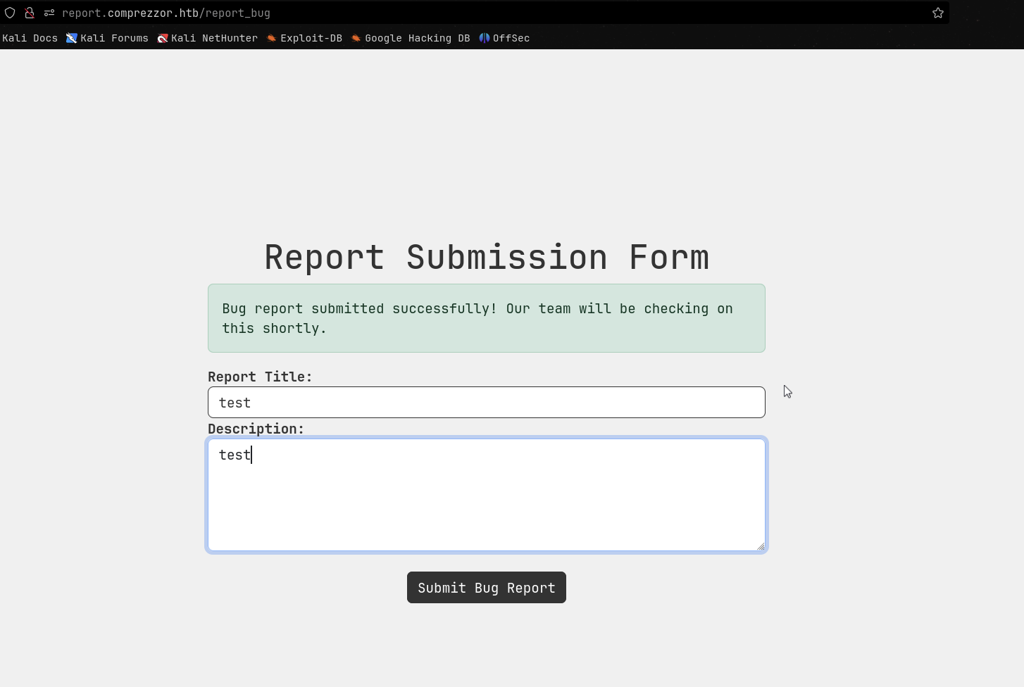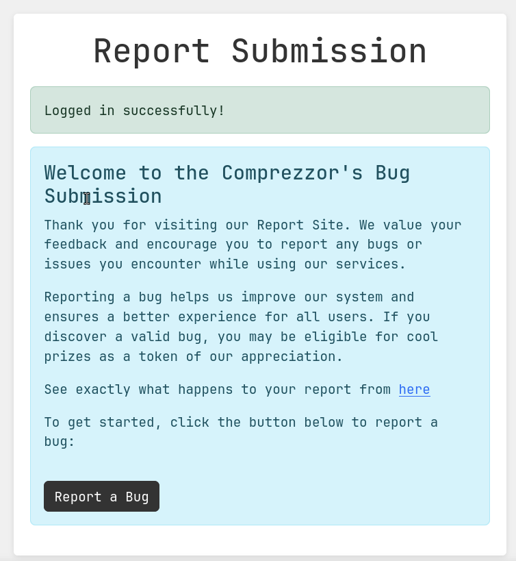 The login page requires username and password. I registered one and explore around, I can see that the user can report bug through a form. And the form is vulnerable to XSS.